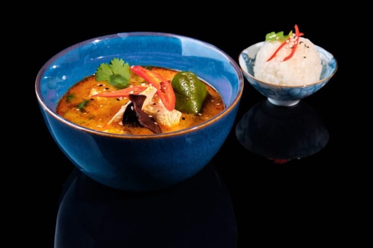 Курка, томати, деревний гриб, кокосове молоко, лемонграс, кафір лайм, імбир, чілі, лайм, окремо подається рис або локшина яєчна