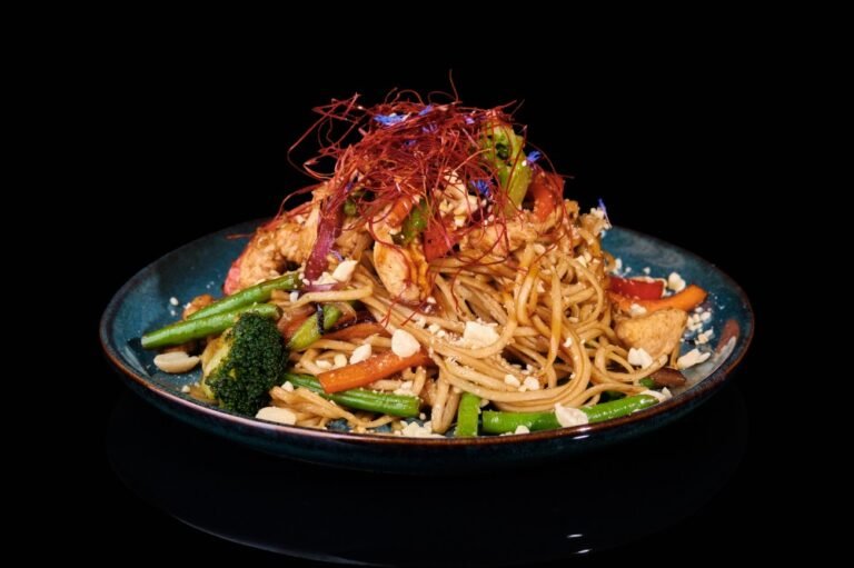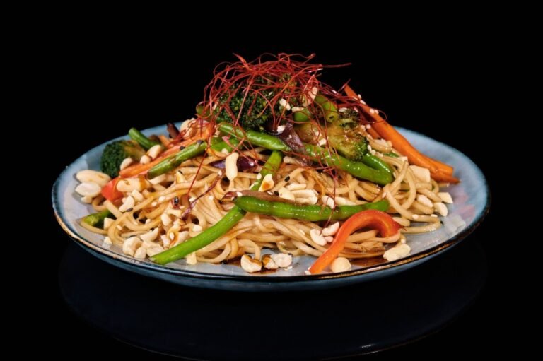 Яєчна локшина, броколі , спаржа, морква , перець болгарський, арахіс , спеції