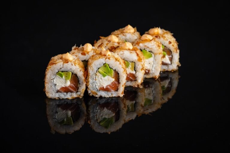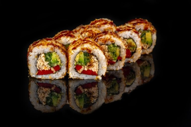 Рис, листя Норi, смажений лосось,огірок , авокадо, перець болгарський , cтружка тунця .