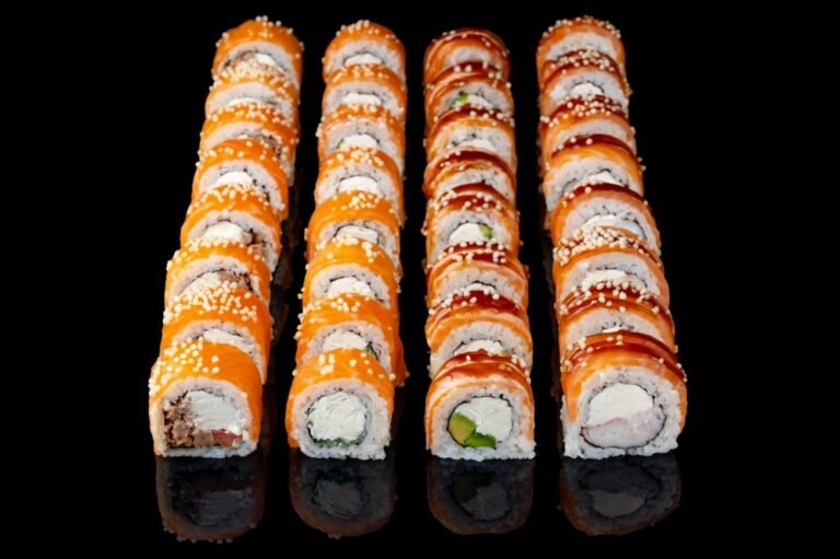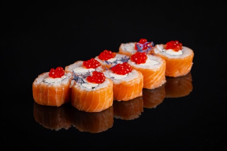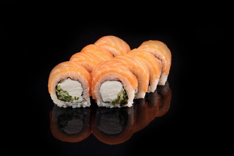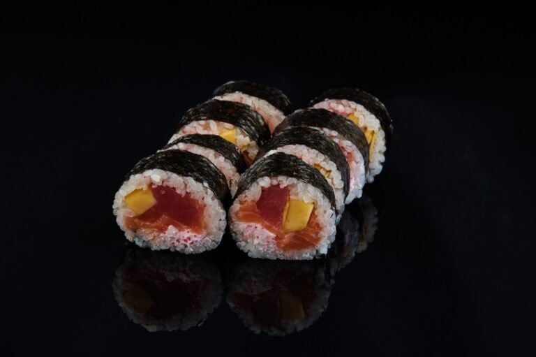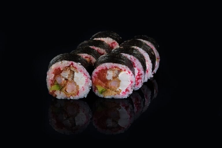 Тунець, лосось, сир Філадельфія, манго, ікра Масаго червона, листя Норі, рис.