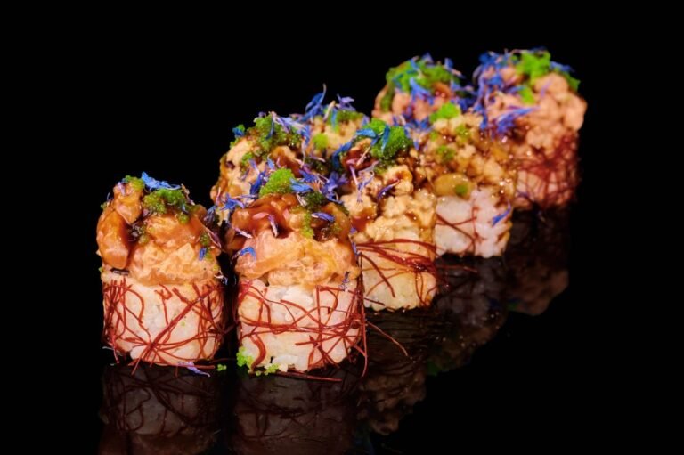 Сніговий краб, ікра зелена “ Масаго” , iкра Червона ,авокадо , листя Норі, рис.
