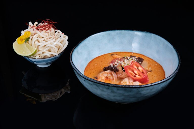Курка, томати, деревний гриб, кокосове молоко, лемонграс, кафір лайм, імбир, чілі, лайм, окремо подається рис або локшина яєчна