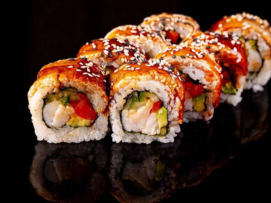 Рис , вугор, листя Норi, авокадо , огірок , перець болгарський , кунжут