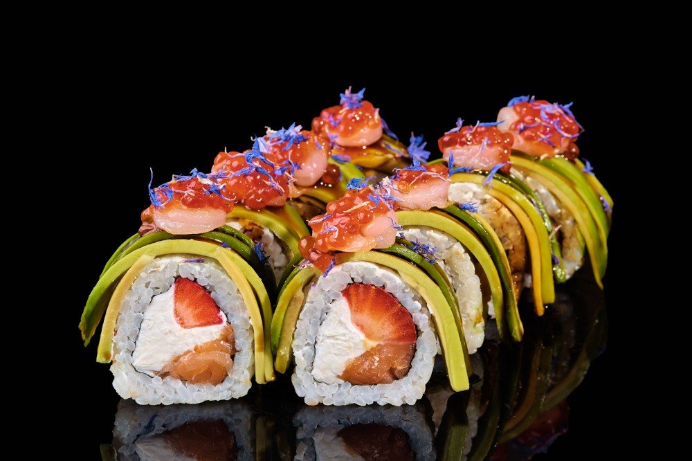 Креветка, лосось, ікра Червона, полуниця, авокадо, сир Філадельфія , лохина сублімiрована , рис.