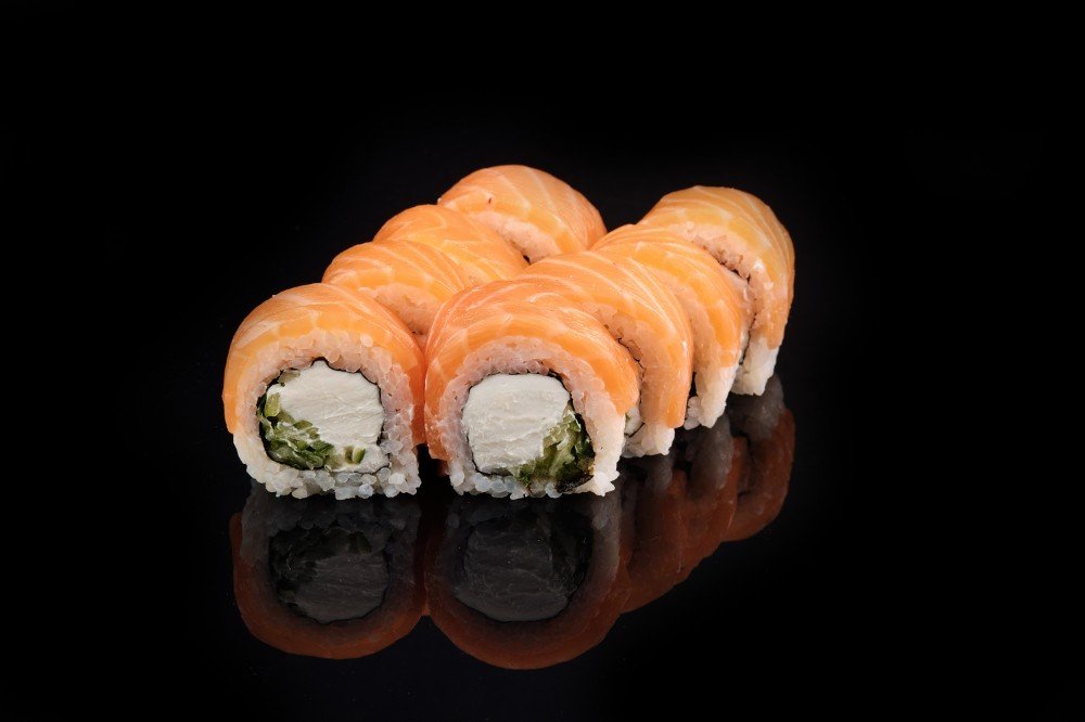 Рис, листя Норі, лосось, вугор, сир Філадельфія, авокадо, огірок, кунжут, соус Унагi.