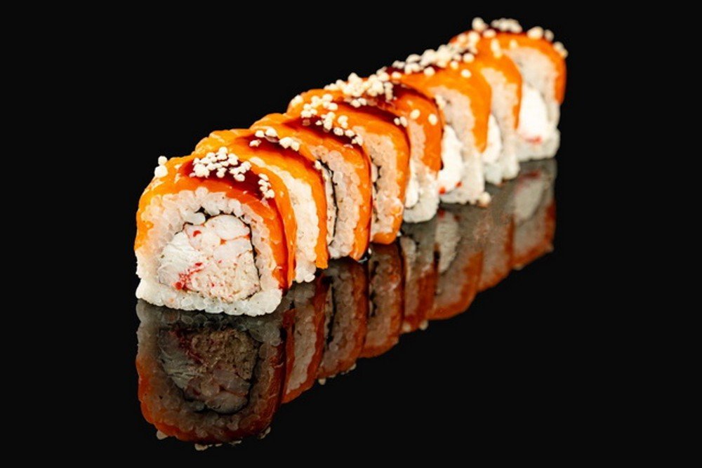 Краб сніжний, креветка Тигрова, ікра Масаго червона , авокадо, манго, Філадельфiя, рис.